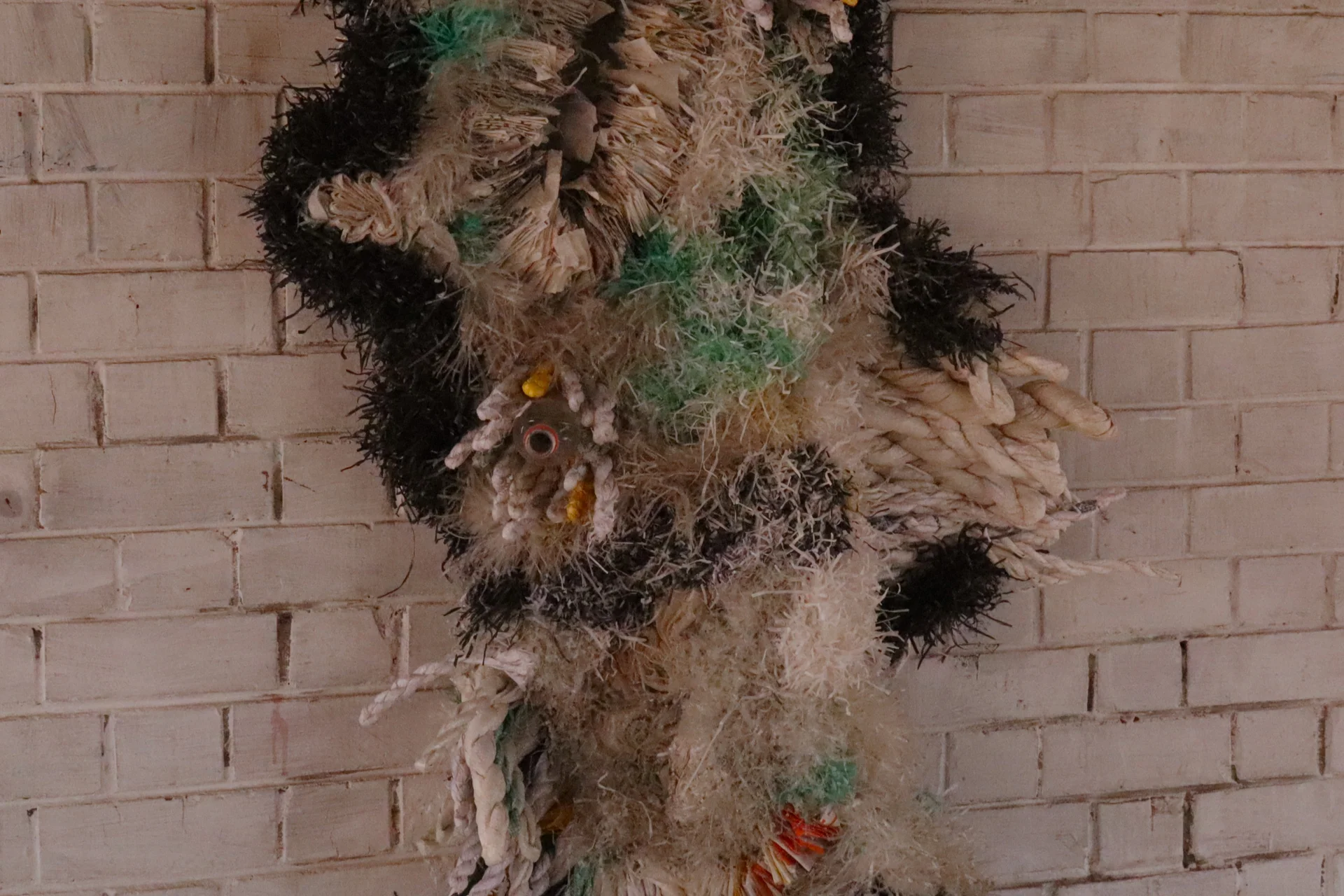 As the eye moves across the work, it encounters a range of textures and materials transformed into forms held together through varying tensions. The piece provokes an internal dialogue, raising questions about plastic consumption and its pervasive use, as well as the relationship African communities share with sacks—often referred to as shangani bags. These sacks resonate with communities on the continent and in the diaspora, representing something different for everyone. They remind those in the diaspora of home, when seen rotating around a conveyer belt during international commutes
