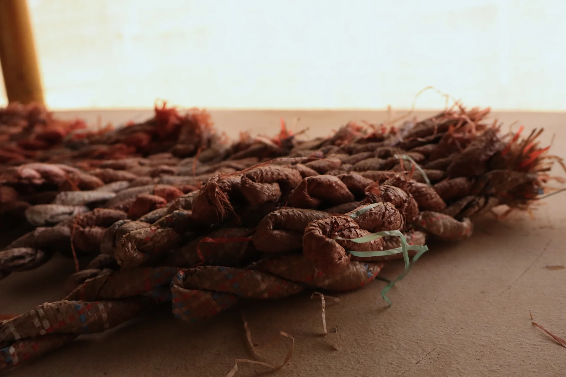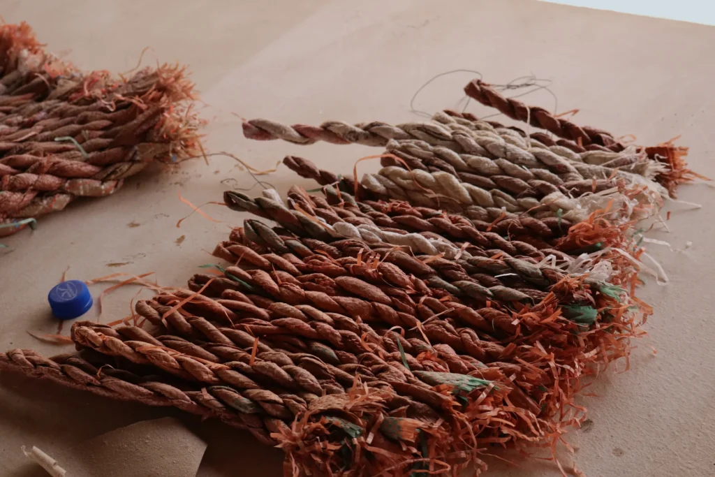 In his work with sacks, which he collects from various locations, Chataika cleans the material before stripping it into lines. He knots, weaves, and manipulates these strips, sometimes preserving their original textures and forms. The resulting lines are gathered to form a unified piece. The shapes in his work vary—some are organic, reflecting the unpredictability of life, while others are inspired by the forms of sacks carried daily by people in his community.