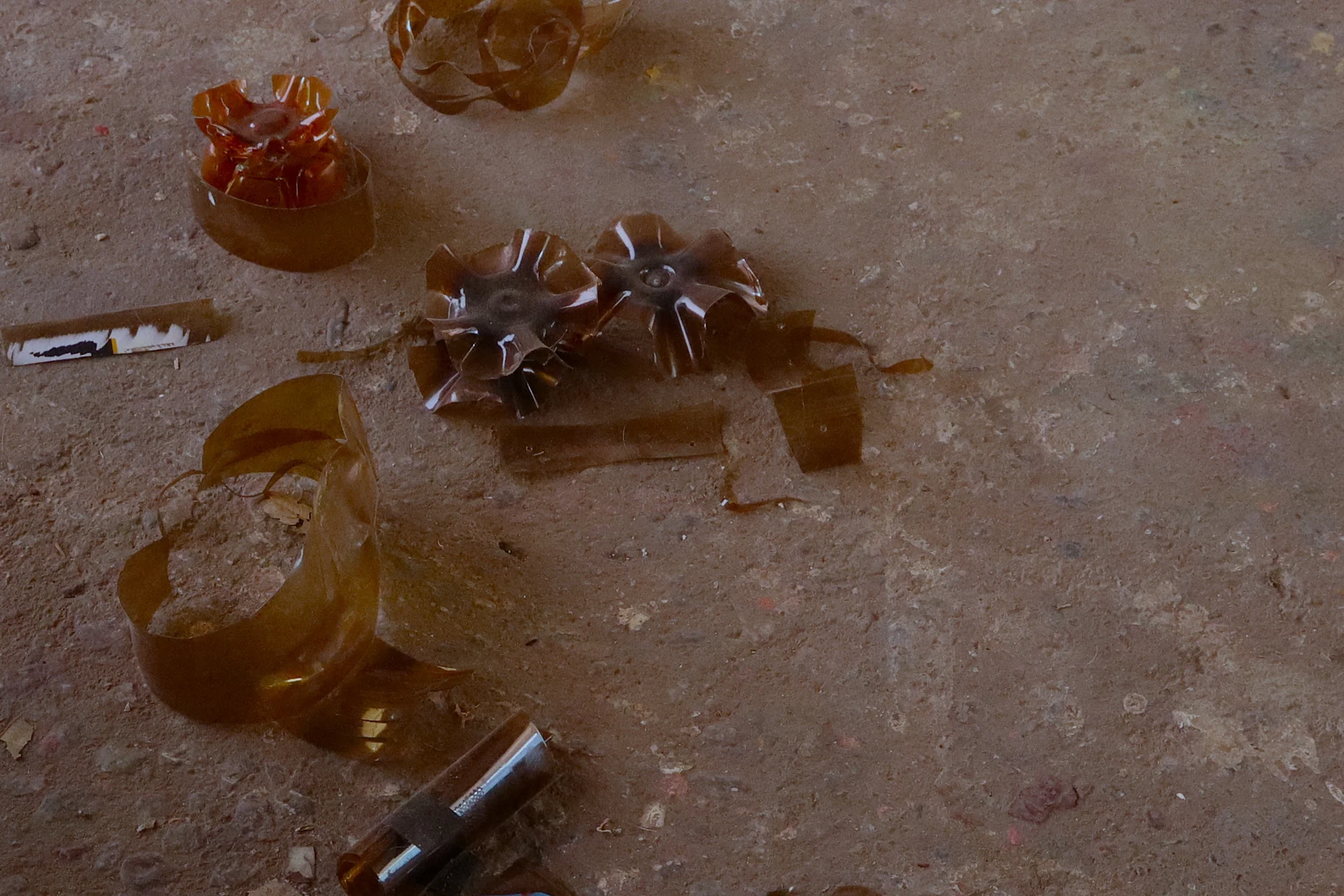 When working with plastic bottles, Chataika begins by collecting discarded transparent bottles from his surroundings. He cleans and disinfects them before cutting the bottom sections into circular forms. Small holes are drilled at the centre of each circle, and fabric is inserted between the plastic layers. These elements are joined using transparent fishing line and later assembled into a single artwork, emphasizing repetition and collective strength.